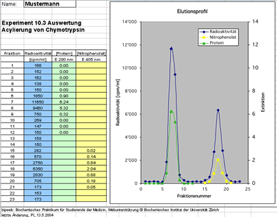 Wieviele aktive Stellen besitzt Chymotrypsin? Die experimentellen Daten aus einem Beispielexperiment geben Ihnen dazu die Antwort. Klicken Sie auf die Grafik um die Daten des Musterexperimentes zu laden.