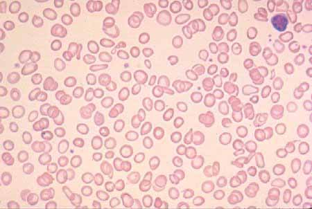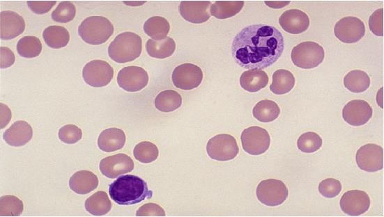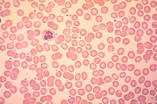 Im Blutausstrich erscheinen die Erythrozyten als runde Scheiben mit einer zentralen Aufhellung. Die Breite der zentralen Aufhellung ist gewöhnlich weniger als ein Drittel des Erythrozytendurchmessers (rund 7 μm). Zwischen den Erythrozyten liegen Blutplättchen und ein neutrophiler Granulozyt (segmentförmiger Kern, eosinophiles Zytoplasma mit feinen staubförmigen, azidophilen Granula)