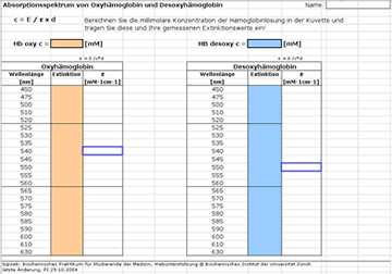 Nachdem Sie das Absorptionsprektrum von Oxyhämoglobin bestimmt haben, messen Sie in gleicher Weise die Extinktionen der Desoxyhämoglobinlösung gegen die Vergleichslösung bei den Wellenlängen zwischen 450 nm und 630 nm.