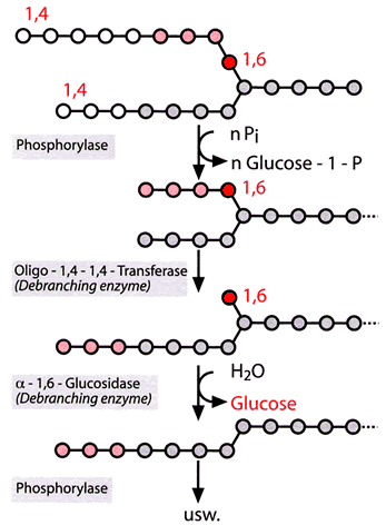 Der Abbau von Glykogen durch Phosphorylase und "Debranching enzyme" liefert Glucose-1-phosphat und freie Glucose im Verhältnis von etwa 10:1. Wie ist dies zu erklären? Wie gross ist der Verzweigungsanteil im Glykogen?