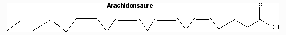 Man findet Arachidonsäure auch häufig als "gestrecktes" Molekül dargestellt, was aber nicht die korrekten Bindungswinkel wiedergibt.