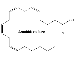 Arachidonsäure ist eine nicht-essentielle, mehrfach ungesättigte Fettsäure (20:4) mit einem Schmelzpunkt von -49°C. Sie kann aus der essentiellen Linolensäure (18:3) gebildet werden. Sie ist die Vorläufersubstanz zur Bildung von Prostaglandinen und Thromboxanen. Arachidonsäure findet sich vor allem als Esterkomponente in Fischtran und in tierischen Phosphatiden.