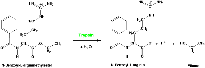 N-Benzoyl-L-argininethylester ist ein künstliches Estersubstrat für die Aktivitätsmessung von Trypsin (für Chymotrypsin wird als spezifisches Substrat N-Benzoyl-L-tyrosinethylester verwendet). Bei der Hydrolyse entsteht die Carbonsäure N-Benzoyl-L-arginin, die mit einem pH-Indikator nachgewiesen werden kann. Dabei wird nur eine saure Gruppe freigesetzt und nicht gleichzeitig auch eine basische Gruppe, wie das bei der Hydrolyse einer Peptidbindung der Fall ist.