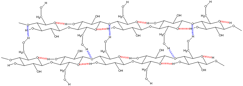 Der Grundbaustein der Cellulose ist Cellobiose, ein Disaccharid in welchem zwei Glucosemoleküle über eine beta-1-4-glykosidische Bindung verknüpft sind. Intramolekulare Wasserstoffbrücken (rot) zwischen den 3-Hydroxylgruppen und den Ringsauerstofffatomen benachbarter Glucosereste verhindern die freie Drehbarkeit der glykosidischen Bindugen, wodurch das Makromolekül in linearer Konformation gehalten wird. Intermolekulare Wasserstoffbrücken (blau) zwischen den 6-Hydroxylgruppen und den Sauerstofffbrücken der glykosidischen Bindugen paralleler Ketten führt zur Bildung von Mikrofibrillen aus 60 bis 70 Celluloseketten, welche für die pflanzlichen Zellwände charakteristisch sind. |