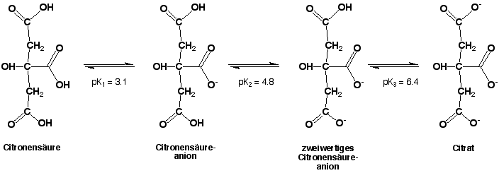 Citronensäure ist eine dreibasige Carbonsäure bzw. eine Tricarbonsäure. Citrat bildet sich im Citratzyklus aus Oxaleacetat und Acetyl-Coenzym A.