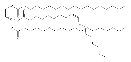 Beispiel eines Triacylglycerins bestehend aus dem zentralen Glycerin verestert mit je einer Stearinsäure an C1 und C3 und einer Ölsäure an C2.
