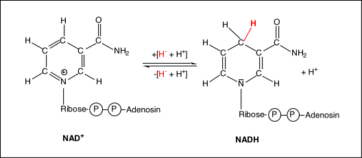 NADH ist die reduzierte Form von NAD+, dem Nicotinamid-adenin-dinucleotid.