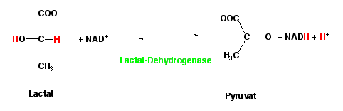Lactat-Dehydrogenase katalysiert die Umwandlung von Lactat (Anion der Milchsäure) zu Pyruvat (Anion der Brenztraubensäure). Sie ist spezifisch für L(+)-Lactat. D(-)-Lactat wird nicht dehydriert.